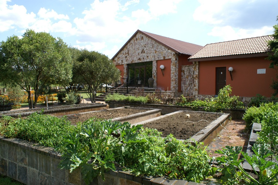 The herb and veggie garden with the hall and ablution block behind.