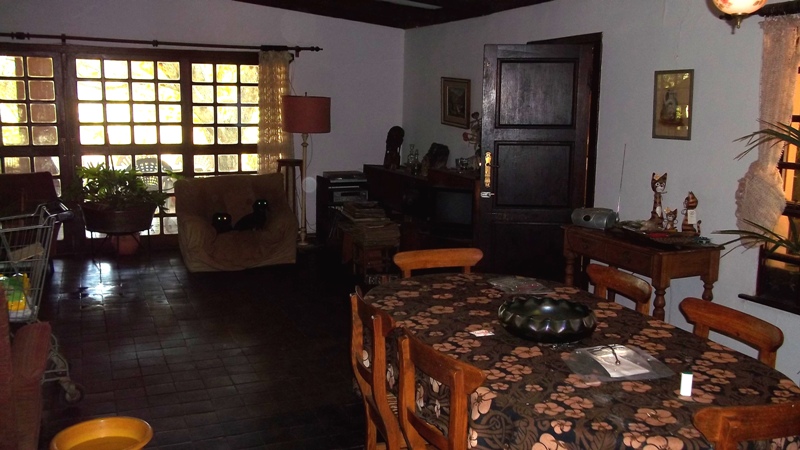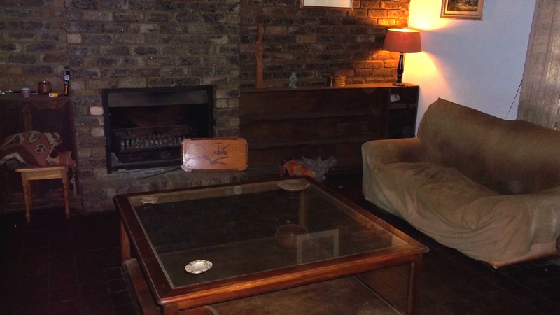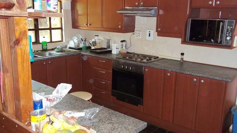 Modern kitchen is open plan to dining and living room with cosy fireplace and French doors to huge patio.