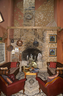 Lounge and reading area with huge fireplace at end of indoor street cafe.