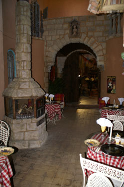 Indoor street cafe with fireplace.
